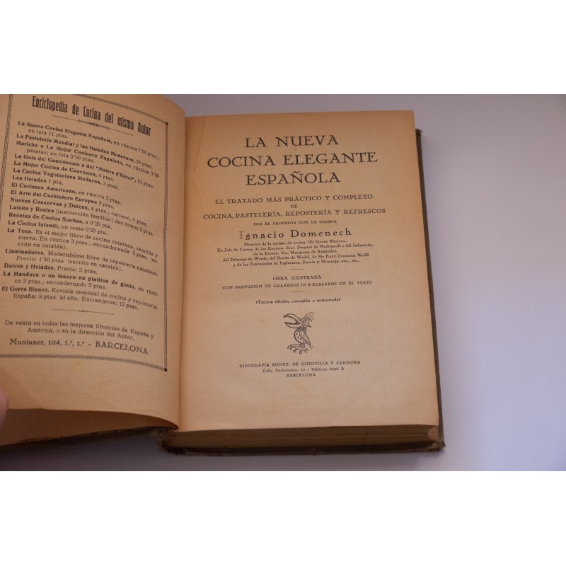 IGNACIO DOMENECH. El tratado más practico y completo de cocina, pastelería, repostería y refrescos. Obra ilustrada con profusión de grabados intercalados en el texto. Tercera edición corregida y aumentada en perfecto estado con el normal paso del tiempo que se puede apreciar en la portada sin uso en oferta.