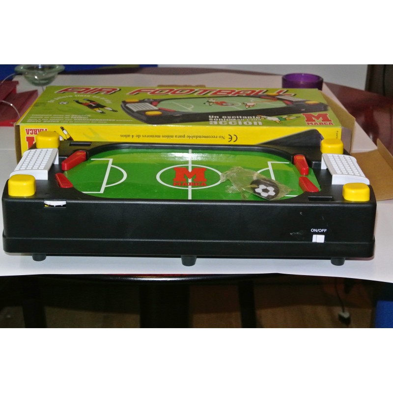 MARCA. Trepidante juego de acción tipo pinball que simula un campo de futbol. La pelota flota mediante aire. Efectos de sonido en cada acción. Este juego de futbol se vendió con el diario Marca. Funciona con dos pilas pequeñas. En perfecto estado y sin uso. año 2007.