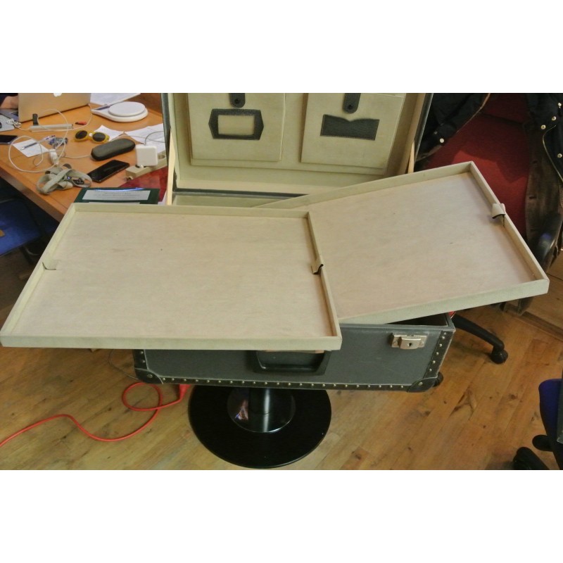 OBJETO. Maleta de representante en semillero rígido con remaches, refuerzos metálicos, 4 bandejas interiores para la exposición de objetos y porta documentos. En perfecto estado de conservación como se muestra en la fotografía. ideal para atrevo, decoración y coleccionismo. Modelo difícil de encontrar en el mercado. Años 60/70 siglo XX