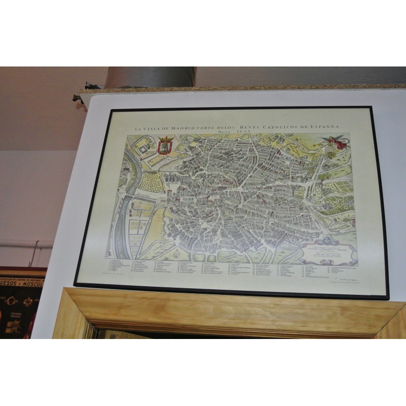 VARIOS. Reproducción de la primera planimetría urbana conocida de Madrid, aunque en un primer momento datada en 1635, posteriormente se da como fecha más probable 1635. Se publico por primera vez en Amsterdam en 1657, formando parte del volumen dedicado a España y sus ciudades en la obra de Jan janssonius. Representa el aspecto de Madrid en los primeros años del reinado de Felipe IV. -existen dos ediciones del plano, nosotros ofrecemos en nuestro catálogo la coloreada. Plano enmarcado en oferta